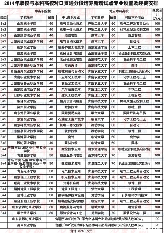 青岛中考网讯:2014年职业院校与本科高校对口贯通分段培养新增试点专业设置及经费安排一览表如下,请大家参考。