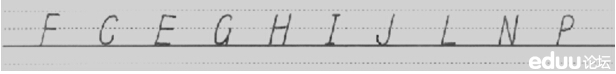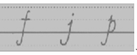 7)占一格、二格、三格的小写字母有f,j,p3个。其中f的上端稍离第一线(和大写字母一样),下端紧贴第四线,短横重合第二线;j的小圆点与i的小圆点位置相同,下面一笔的上端顶第二线,下端紧贴第四线;p的上端略高于第二线,约占第一格的三分之一,下端紧贴第四线。