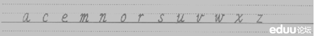 3)占中间格的小写字母有a,c,e,m,n,o,r,s,u,v,w,x,z13个,它们笔画的上端必须紧贴第二线,下端必须紧贴第三线,不许离线也不许出格。