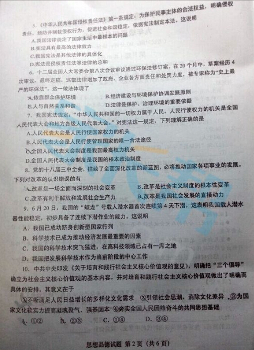 2015年青岛市南区4月中考模拟考试思想品德试题(2)
