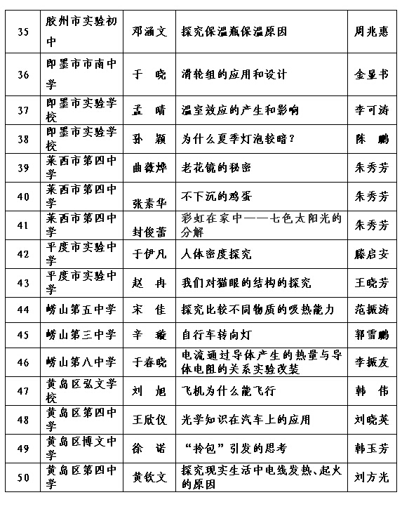 2015年青岛市初中物理学生探究性学习成果评选结果(14)