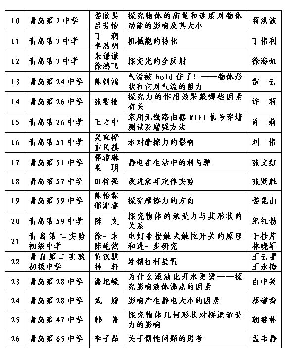 2015年青岛市初中物理学生探究性学习成果评选结果(3)
