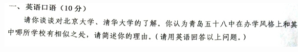 第一题,英语口语表达题,让你谈谈对清华北大的了解。说说58中跟哪所学校风格像。这个问题还比较好答,学生答的还比较轻松。通过对比,跟学校相结合,引导学生对学校发展的一些思考。