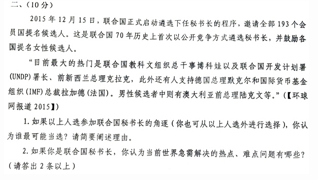 第二题联合国问题,列举参选人,谁会当选,如果让你当联合国秘书长,你会怎么解决当下的热点问题。这个问题比较难,平时看的新闻少或者不是很关心时事新闻热点的,真的不知该从何入手。