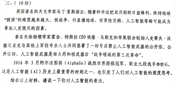第三题谈谈对人工智能的看法。这个问题还比较好回答,学生一般从科技是把双刃剑展开,题目里也提到了科学家联合抵制禁止人工智能武器,最近的人工智能阿尔法狗战胜李世石。引导学生关注人文、思考科技带给人类的改变。