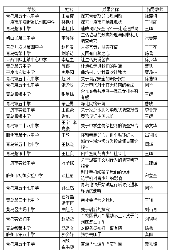 2016年青岛市初中思想品德学科探究性学习成果评选结果的通知(8)