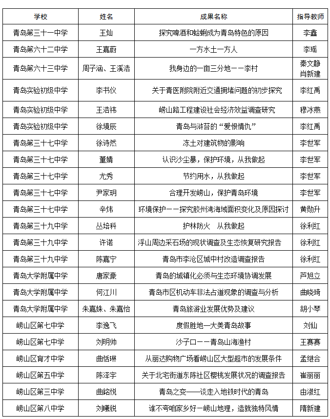 2016年青岛市初中地理学科探究性学习成果评选结果通知(6)