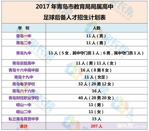 2017年青岛市教育局局属高中学校,共计12所学校招收207个足球后备人才,其中明确提成招收女足的合计86人。
