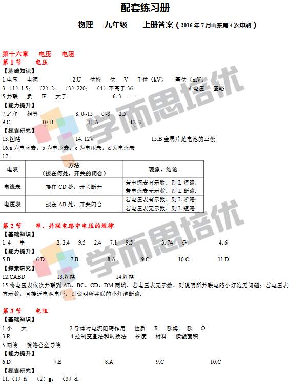 人教版九年级物理配套答案第16章 电压和电阻
