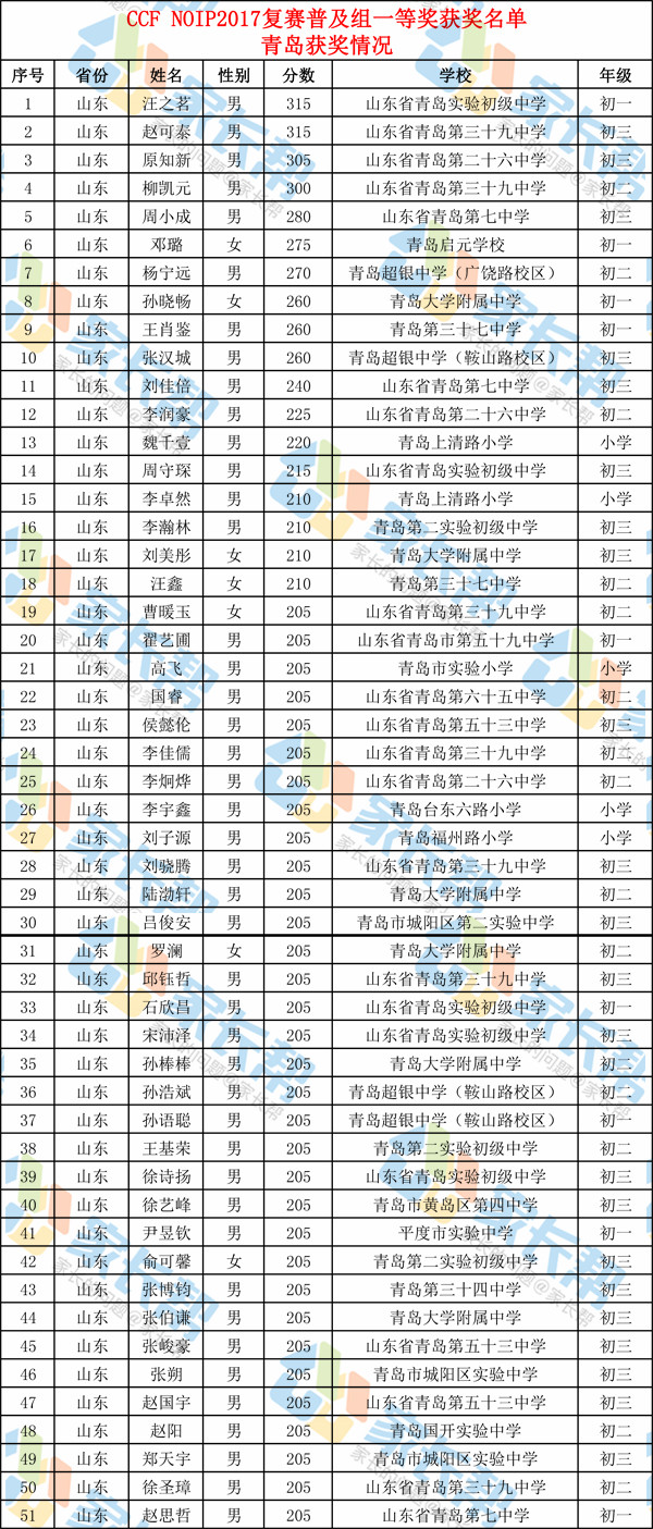 2017年全国青少年信息学奥林匹克联赛(NOIP)山东复赛,普及组共177人获得一等奖,分数线为205。 青岛共51人获得一等奖,青岛实验初级中学的汪之茗和青岛39中的赵可泰得分315分的高分,并列青岛市的第一名,同时也是山东省第一名。