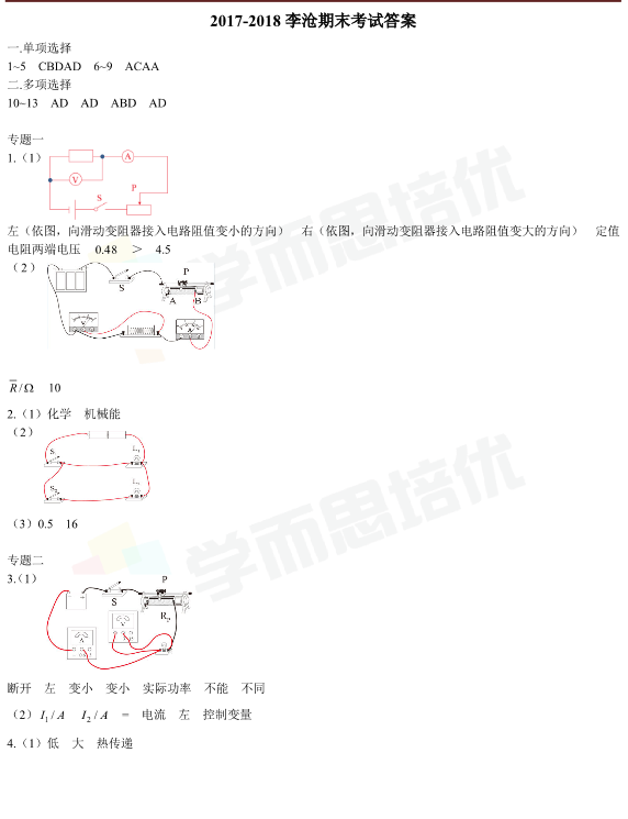2017-2018学年青岛李沧九年级上学期期末物理试题答案(3)