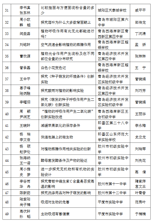 青岛市第七届初中学生创新实验展评生物获奖名单(5)