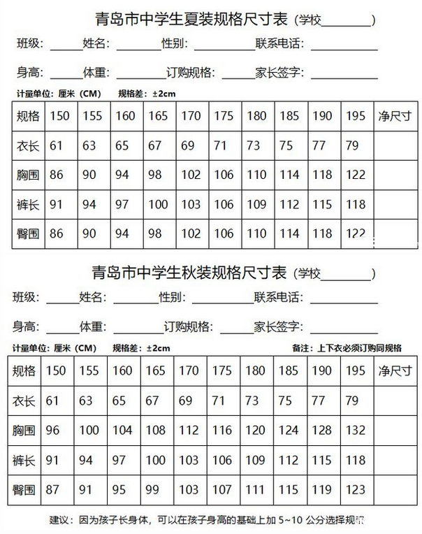 4、确定校服规格尺寸(提前在家商定好校服尺寸)